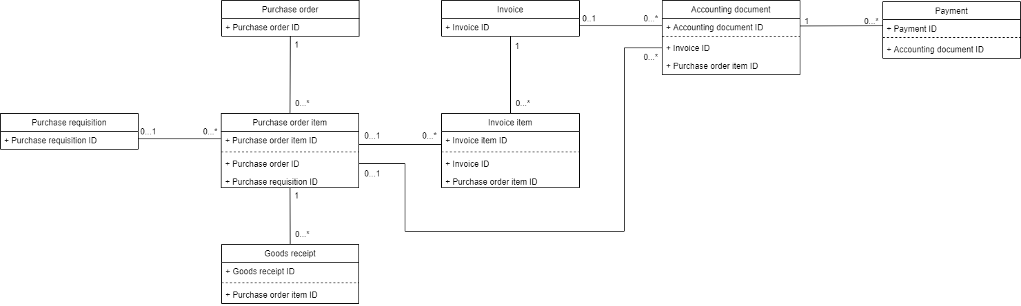 The SAP system allows accounting documents in the BKPF table to be created in multiple ways. The default way is when an invoice (in the RBKP table) is created and released into accounting. However, it is also possible to create an accounting document without an invoice. In this case the accounting document is linked to purchase order items directly, using the EBELN and EBELP fields available on the BSIK and BSAK tables. This sub-process is used to gather additional events for the event log, which is done in the Object_relations.sql table.