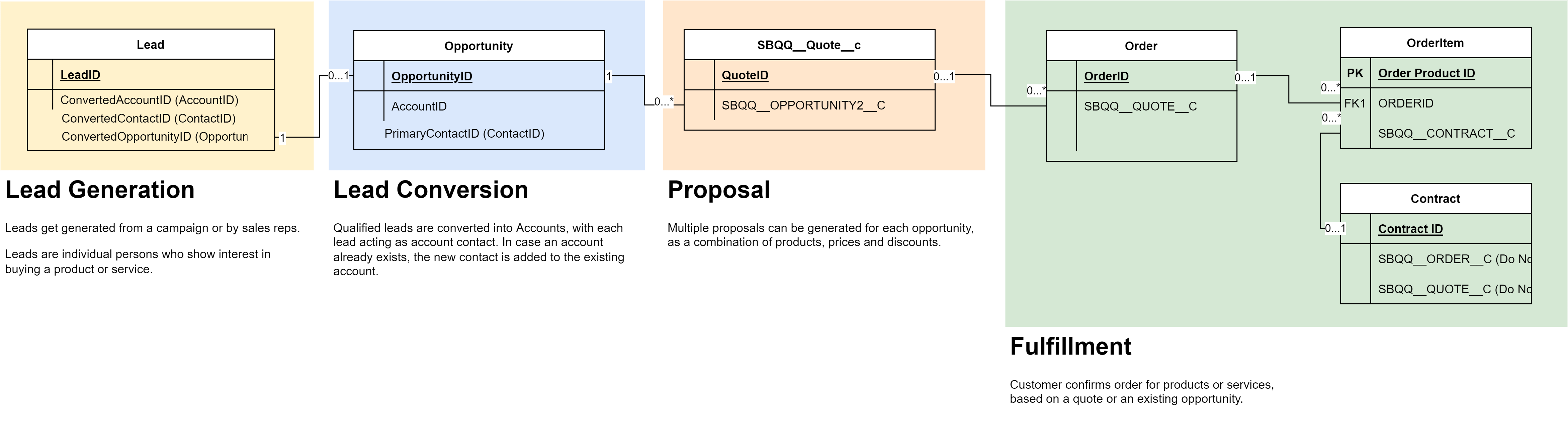 As a lead qualifies into an opportunity, the sales team will work on the opportunity together with the potential customer, in order to identify the need and suggest an appropriate product or service which will meet this need. In case the opportunity is won, this will generate one or more orders in order to fulfill the won opportunity. In Salesforce, this is tracked via the Opportunity object, and the Quote object.