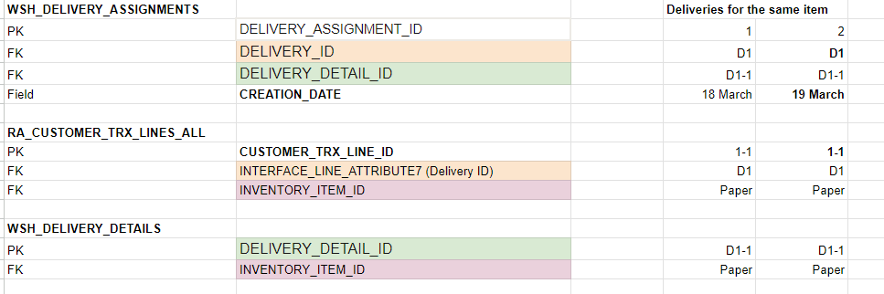 This model was created using the RA_CUSTOMER_TRX_LINES_ALL transactional table. The relationship between the Invoice item and the Delivery (at header level) is stored in the WSH_DELIVERY_ASSIGNMENTS table. In that table, the delivery item ID is not a primary key. For that reason, a specific logic to bring only one per Invoice item was designed.