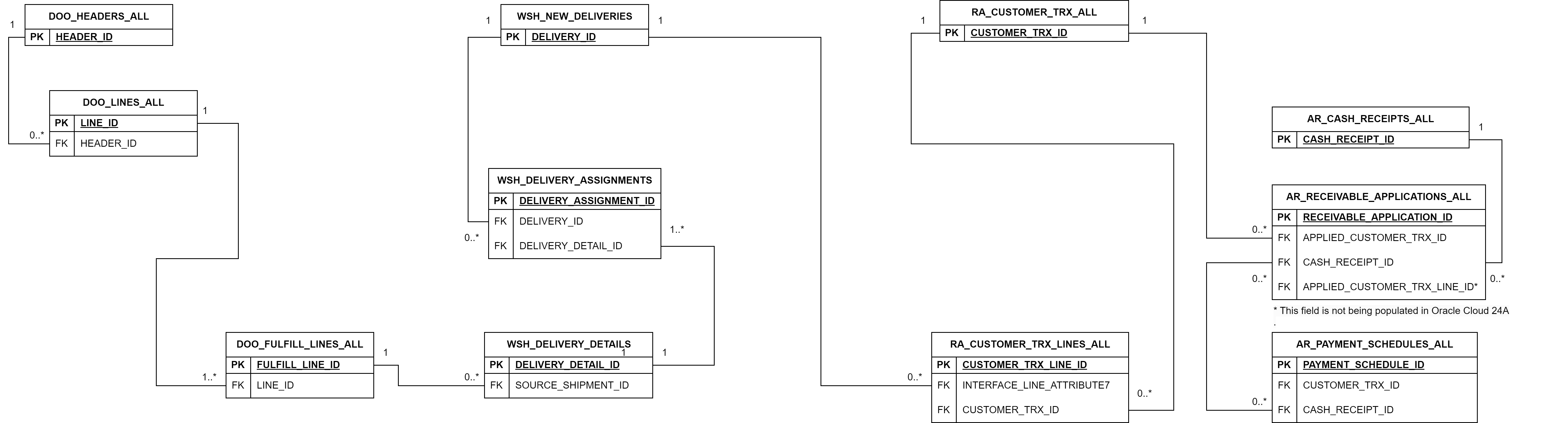 The receipt creation is stored in the AR_CASH_RECEIPTS_ALL transactional table and this is used to create this model. This model will only track the payments associated to invoices, for that reason the Payment ID is taken from the AR_RECEIVABLE_APPLICATIONS_ALL table, by doing an inner join.