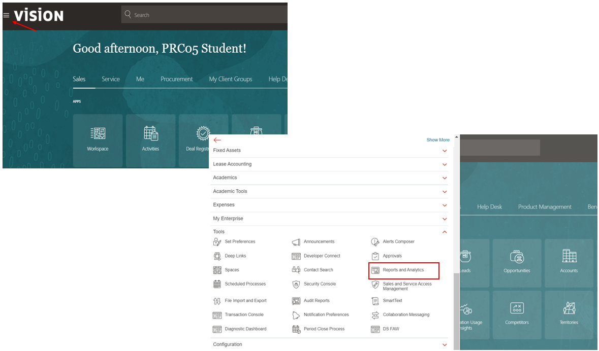 Note: The illustrations belong to another business process but they represents clearly the steps to follow in order to execute Oracle Cloud reports.