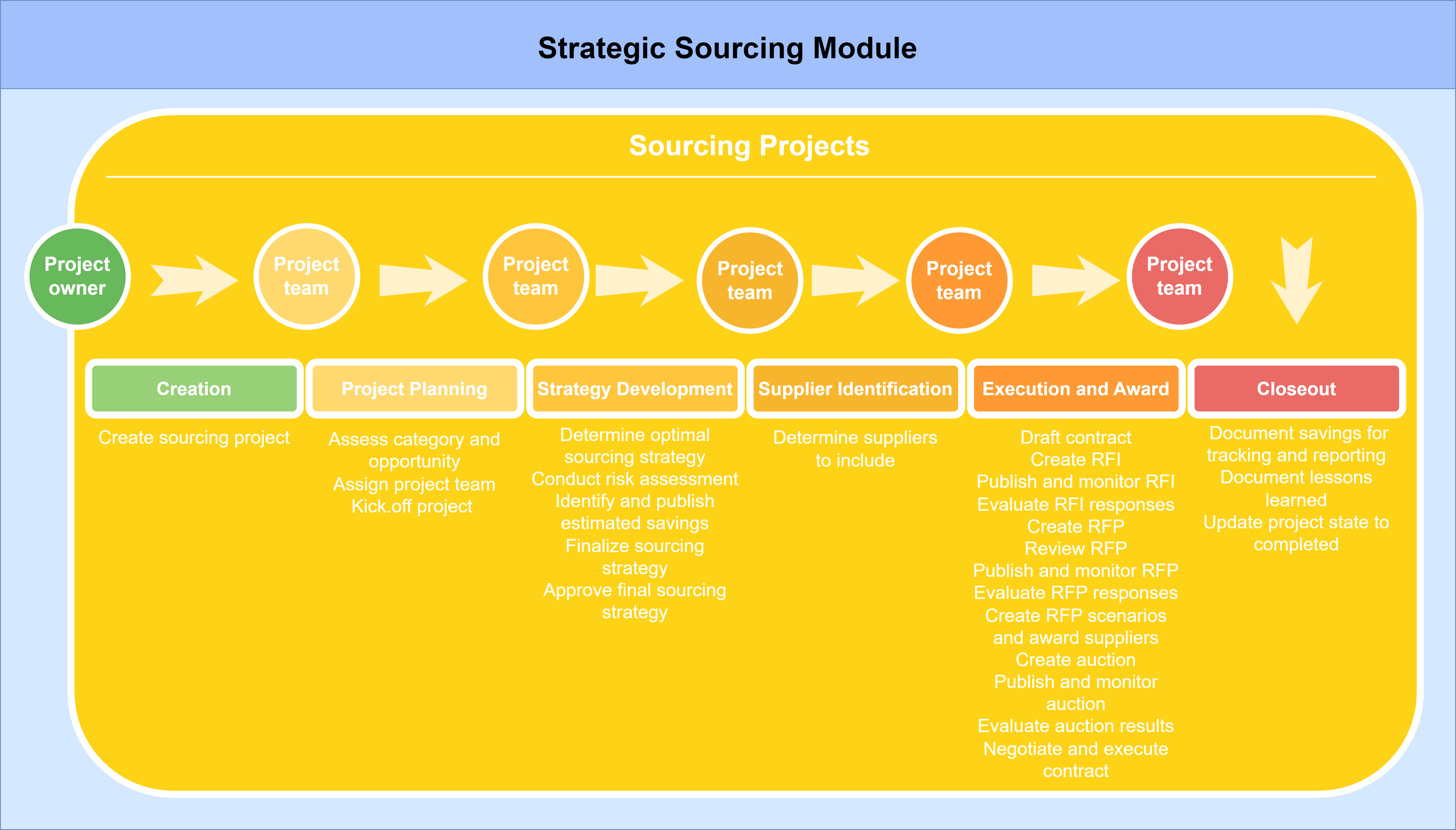 This app template was built for the SAP Ariba Sourcing process. This is an end-to-end process which usually starts with the creation of a sourcing project. Then, the standard project events are created and executed. These events comprise the basic steps needed for a sourcing project, such as: